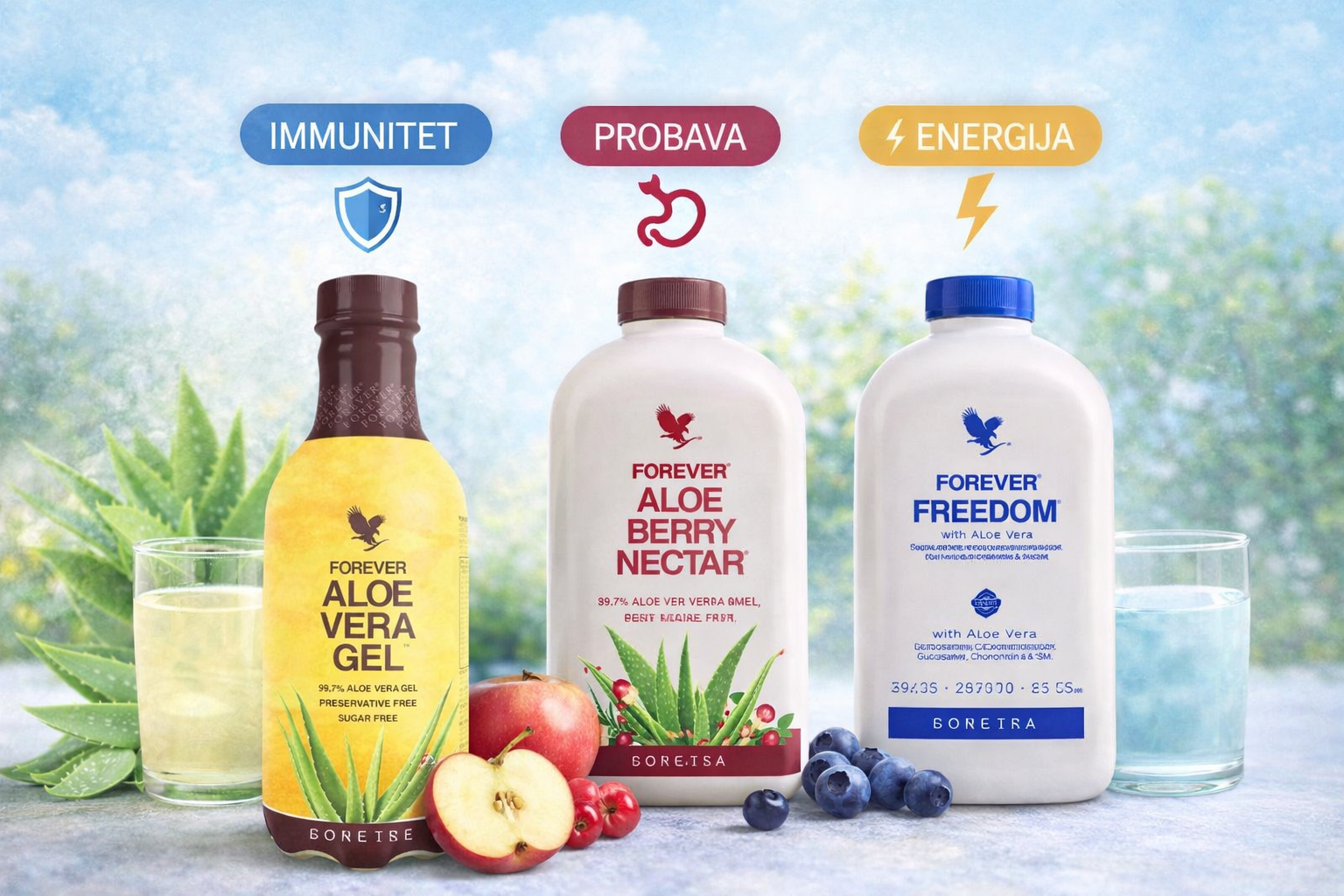 Forever Aloe Vera Gel je prirodni napitak sa čak 99,7% čistog aloe vera gela, bez vještačkih dodataka i konzervansa. Bogat je vitaminima, mineralima i aminokiselinama, pa doprinosi jačanju imuniteta, detoksikaciji organizma i boljoj probavi. Zahvaljujući posebnoj tehnologiji obrade, nutrijenti iz aloe vere se apsorbuju i do 3 puta efikasnije.